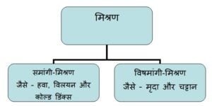 - विषमांगी मिश्रण:वह मिश्रण जिसके अंश भौतिक रूप से अलग होते है और इसके कणों को अलग-अलग पहचाना जा सकता है, विषमांगी मिश्रण कहलाता है | जैसे : लोहे के बुरादे और बालू का मिश्रण |