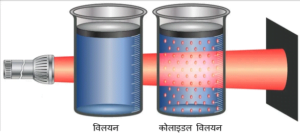 कोलाइडल के छोटे-छोटे कण प्रकाश के किरण को फैला देते है इस प्रकार प्रकाश के किरण का फैलाना टिंडल प्रभाव (Tyndall Effect) कहते है |